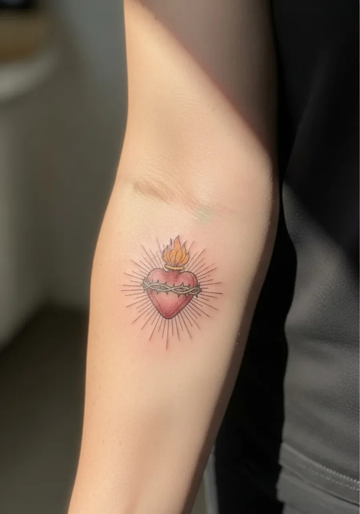 This tattoo sits neatly on the inner arm and features a small sacred heart design.
