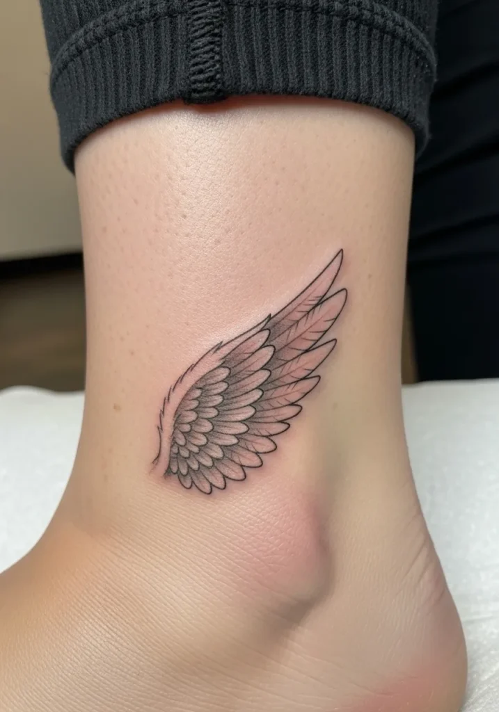 This piece shows a single angel wing tattoo placed just above the ankle.