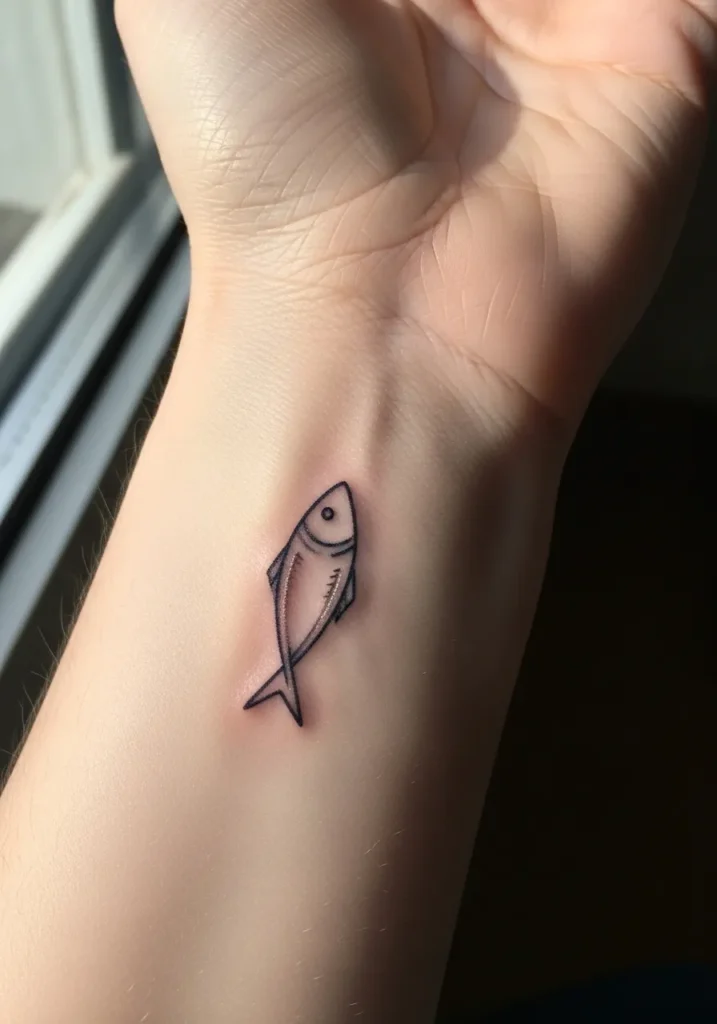 This tattoo features a small ichthys fish symbol placed on the inner wrist.