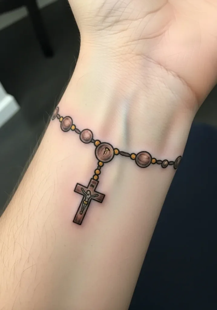This tattoo wraps around the wrist like a delicate rosary bracelet.