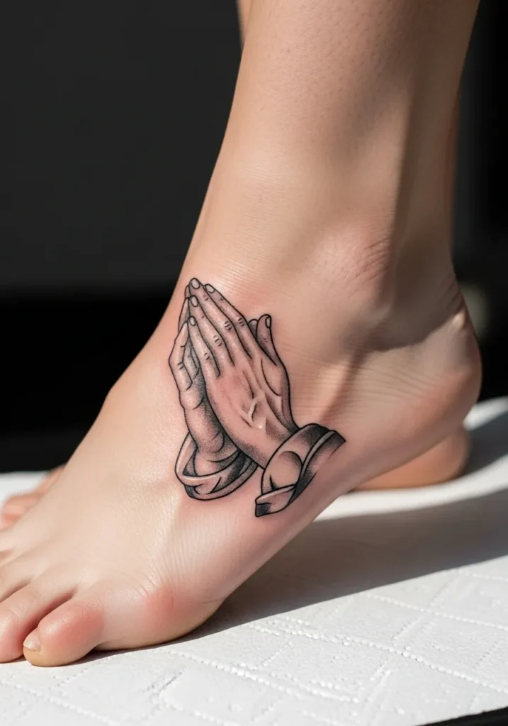 This tattoo features small praying hands placed gracefully on the top of the foot.