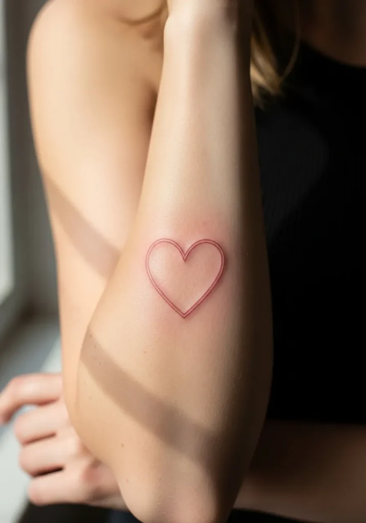 This tattoo shows a small outlined heart placed softly on the upper arm.