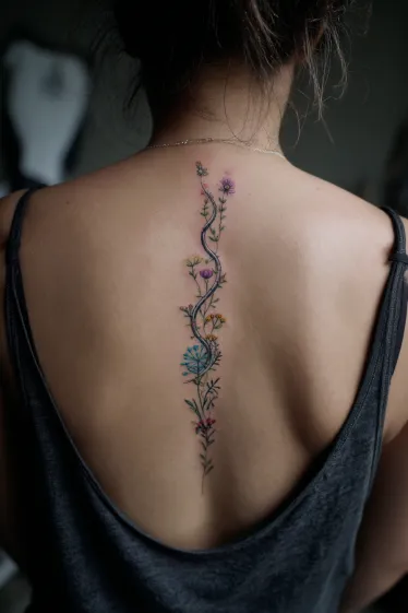 This tattoo flows gracefully down the spine with a winding design that feels almost like a serpent made of delicate blooms. Bright wildflowers in shades of pink, yellow, and blue twist together to form a soft, snake-like curve. The mix of fine lines and subtle shading gives it a lightweight look, almost like the flowers are floating across the skin.