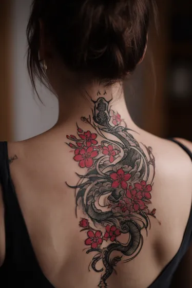 This tattoo shows a beautifully detailed snake twisting its way down the spine, surrounded by vivid red cherry blossoms. The snake itself is shaded in dark tones that make its scales look textured and realistic, while the blossoms burst with bold color, creating a striking contrast. The flowing movement of the design makes it feel alive, as if the snake is weaving through the flowers in motion.