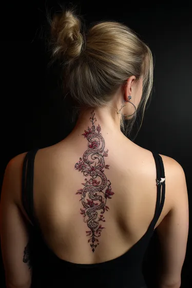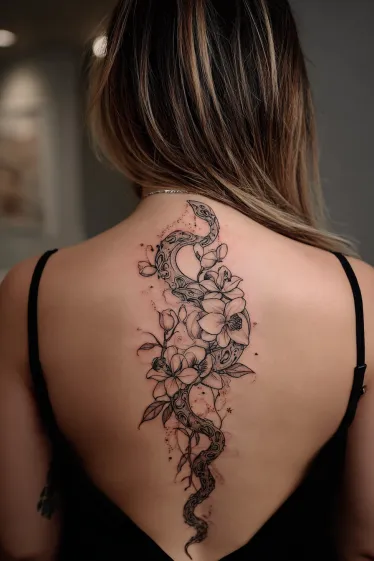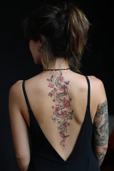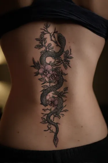 This tattoo shows a dark snake curving down the spine, intertwined with soft flowers and leafy branches. The scales are carefully detailed, giving the snake a textured and lifelike feel, while the blossoms bring a hint of femininity with their gentle pink tones. The design follows the line of the spine perfectly, making it look elegant and balanced from top to bottom.