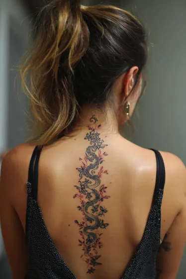 I adore this design because it captures both beauty and mystery in one look. The sakura flowers make it delicate and romantic, while the snake brings in that fierce edge that feels so empowering. It’s the kind of tattoo that tells a story on its own, and I love how it turns the spine into a canvas for something truly eye-catching.