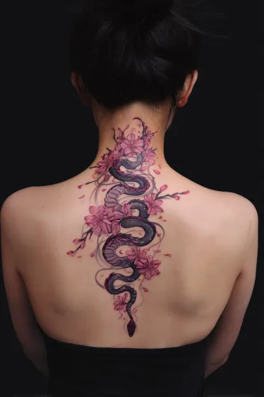 This tattoo features a detailed black snake winding gracefully down the spine, surrounded by soft pink cherry blossoms. The blossoms are delicately shaded, giving them a light and airy feel that contrasts beautifully with the darker tones of the serpent. The placement and flow make the design look elegant and natural, almost as if the snake is weaving through a blooming tree branch.