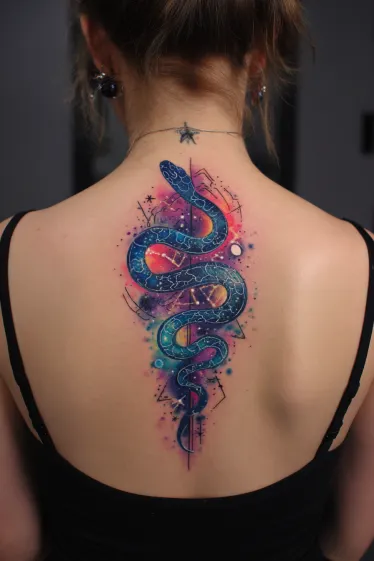This tattoo shows a glowing serpent winding down the spine, filled with vivid shades of blue, purple, and red that look like a galaxy painted on skin. The snake’s body sparkles with star-like details and nebula swirls, while geometric lines and glowing orbs surround it, giving the whole design a cosmic, otherworldly feel. It is bold, colorful, and impossible to ignore.