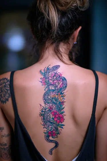 This tattoo features a long snake winding perfectly along the spine, decorated with delicate floral accents that soften its fierce appearance. The scales are shaded with intricate detail, giving the snake a realistic texture, while the surrounding blossoms add pops of color that brighten the entire piece. The placement makes it flow naturally with the shape of the back, creating a design that looks both balanced and striking.
