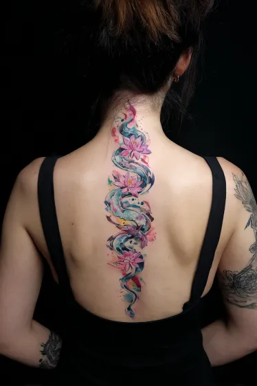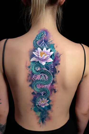 This tattoo shows a serpent flowing gracefully down the spine, wrapped in dreamy watercolor shades of teal, purple, and pink. The snake is detailed yet softened by the vibrant brushstroke effect, making it blend beautifully with the background. Large lotus flowers bloom along its path, one near the upper back and another at the lower spine, adding depth and a serene, balanced touch to the design.
