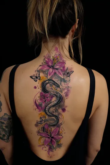 This tattoo features a coiled snake winding down the spine, framed by large lilies in shades of pink and purple. The flowers are vibrant and full of life, while the snake is inked in darker tones that create a bold contrast. Butterflies flutter around the design, adding a soft, delicate touch that balances out the intensity of the serpent. The watercolor splashes in the background give it a dreamy, artistic finish.