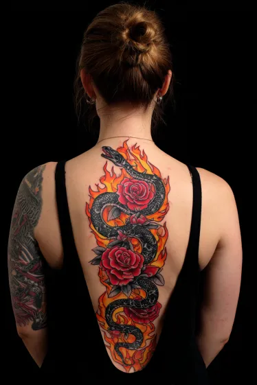 This tattoo features a black snake coiling down the spine, surrounded by bold red roses and fiery flames. The roses are shaded with deep crimson petals that stand out against the darker tones of the snake, while the flames in vibrant orange and yellow add intensity and movement to the piece. The entire design flows beautifully down the back, creating a powerful and dramatic effect.