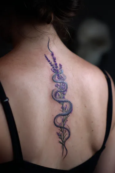 This tattoo shows a slender snake winding gracefully down the spine, entwined with sprigs of lavender in soft purple tones. The snake’s body is detailed with fine scales, while the lavender adds a delicate touch that makes the whole design feel calming and elegant. Its vertical placement follows the natural curve of the back, creating a design that looks balanced and graceful.