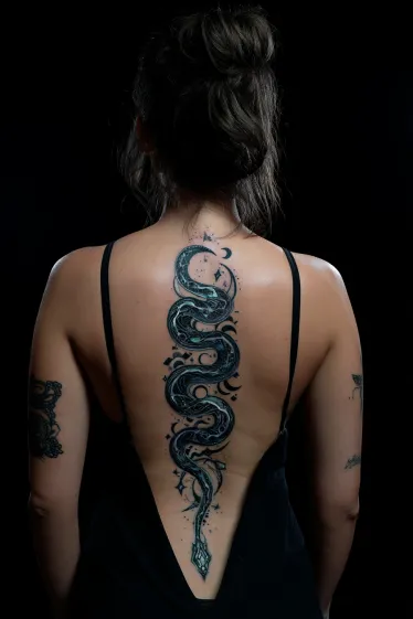 What I love about this tattoo is how it feels dark and mysterious without losing its elegance. The celestial touches make it feel magical, almost like the snake is guarding hidden secrets. To me, it’s a gorgeous choice for anyone who wants a spine tattoo that’s powerful, stylish, and full of personality.