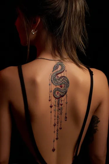 This tattoo highlights a coiled snake placed high along the spine, with intricate shading that gives the scales a textured and lifelike look. From the snake’s body hang delicate chains and gem-like ornaments in deep red, creating the illusion of jewelry cascading down the back. The placement is elegant and vertical, drawing the eye naturally along the line of the spine.