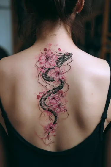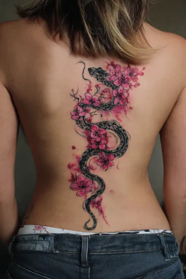 This tattoo features a dark snake coiling its way down the spine, intertwined with vivid pink blossoms that bloom across the back. The flowers are inked with bold splashes of watercolor shading, giving them a soft yet striking look that contrasts beautifully with the snake’s detailed black scales. The placement stretches from the upper back down to the lower spine, making it a full-length statement piece.
