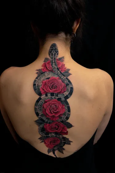 This tattoo showcases a bold black snake winding down the spine, its body wrapped around large, vibrant red roses. The snake’s detailed scales add texture and depth, while the roses bloom in full color, creating a striking contrast that draws the eye instantly. The symmetrical placement of the flowers along the snake’s body makes the entire design look balanced and powerful.