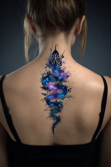 This tattoo features a serpent winding down the spine, painted in vibrant galaxy hues of blue, purple, and pink. The snake’s body glows with cosmic energy, filled with star-like speckles and nebula-like swirls, while the watercolor splashes around it add a dreamy, celestial effect. The design flows vertically, creating a bold and eye-catching centerpiece across the back.