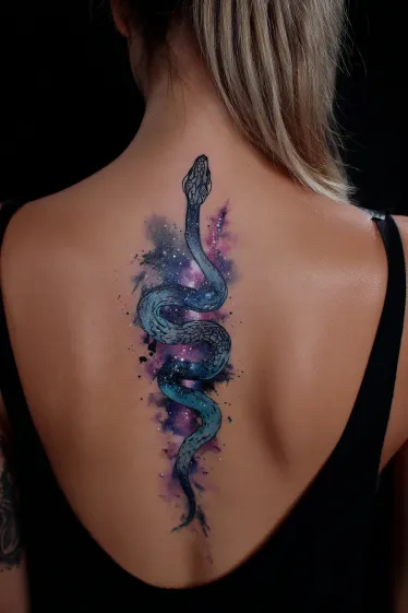 This tattoo shows a sleek snake winding down the spine, surrounded by glowing galaxy shades of purple, pink, and blue. The serpent’s body is highlighted with star-like sparkles, blending seamlessly into the cosmic watercolor background. The placement makes the design appear as if the snake is gliding through a dreamy night sky painted across the back.