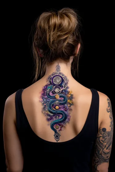 This tattoo shows a serpent gliding down the spine, wrapped in glowing cosmic colors of purple, teal, and gold. Along its path are planets and moons, perfectly aligned to give the design a celestial vibe. Intricate ornamental details frame the top and bottom, making the entire tattoo look like a mix of art and mysticism. The placement creates a vertical flow that draws the eye straight down the back.