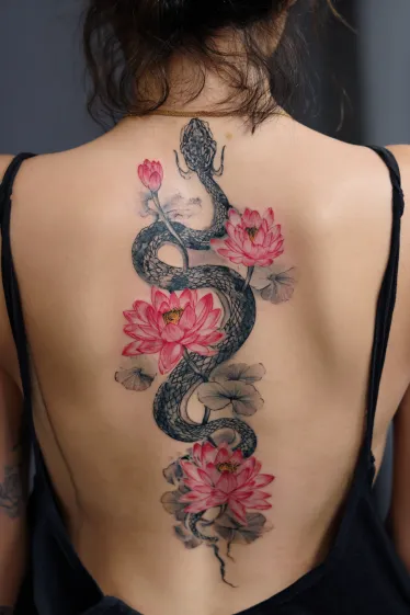 This tattoo showcases a dark, textured snake winding gracefully down the spine, surrounded by large, vivid pink lotus flowers. The bold contrast between the deep scales of the snake and the delicate softness of the blossoms creates a powerful balance of strength and beauty. The placement along the spine makes the whole design feel fluid, as if the snake and flowers are naturally growing together.