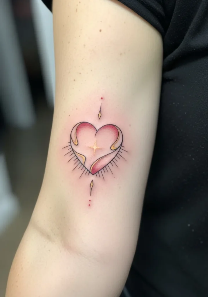 This tattoo features a small to medium sacred heart design placed on the inner upper arm, done in fine line style with soft pinks and warm red tones. The heart has subtle rays and delicate shading that give it a calm glow without feeling heavy. The lines are clean and airy, and the size feels intimate rather than bold, making it perfect for a spot that feels personal and close.