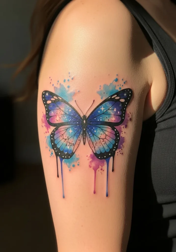 This tattoo shows a medium sized butterfly on the upper arm, created in a watercolor style with vibrant blues, purples, and hints of pink. The ink softly drips and blends, giving the wings a sense of motion and lightness. The placement highlights the shoulder beautifully and feels playful yet meaningful.