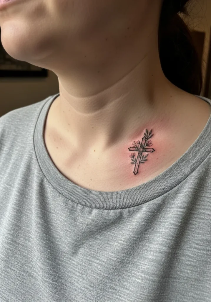 This tattoo is a small cross placed just below the collarbone, done in fine line style with subtle shading and a touch of soft color. The design is simple and understated, letting the placement and meaning speak for themselves. It feels intimate and quietly powerful.