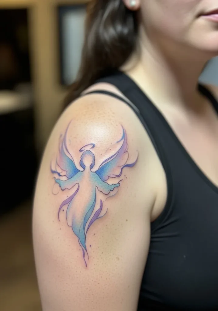 This tattoo shows a medium sized angelic figure on the upper arm, created with flowing lines and soft blues and purples. The watercolor style adds movement and emotion, while the figure itself feels gentle rather than dramatic. The placement gives the design space to breathe.