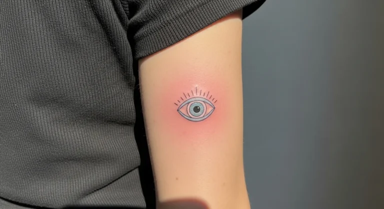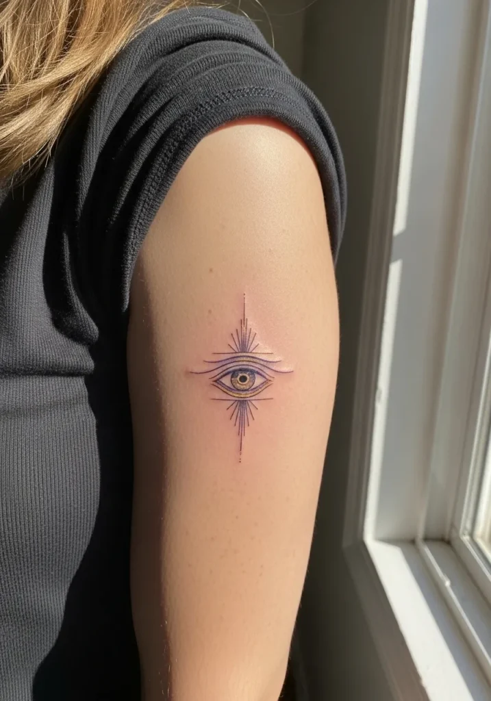 This design features a small evil eye tattoo on the upper arm, colored in light blues and pinks with fine line details around the eye. The style is minimal but still playful, and the soft colors keep it from feeling too bold. The placement makes it easy to see without feeling exposed.