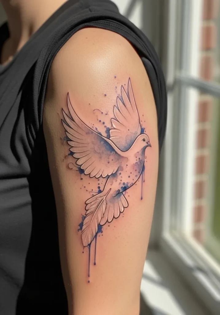 This tattoo shows a medium sized dove in flight on the outer upper arm, created with fine lines and soft blue gray coloring. The wings are detailed but still light, with gentle movement in the feathers that keeps it from looking stiff. The placement allows the design to follow the natural curve of the arm beautifully.