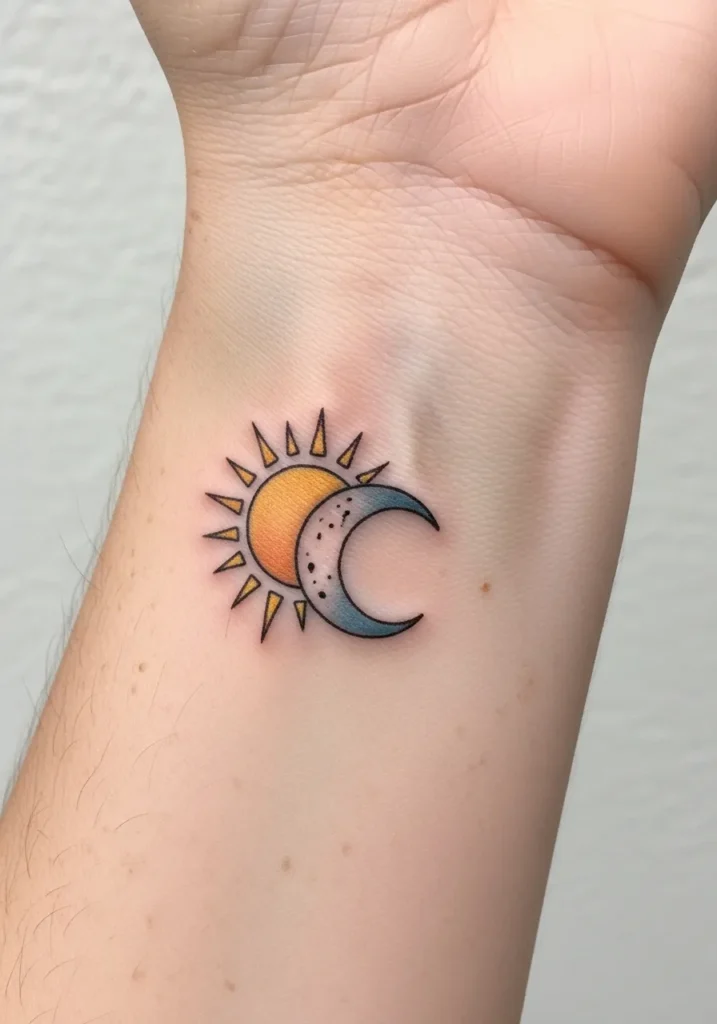 This tattoo shows a small sun and crescent moon paired together on the inner forearm, colored in warm golds and soft blues. The fine line style keeps the design clean, while the color adds just enough warmth to make it glow. The size feels perfect for a daily reminder piece.