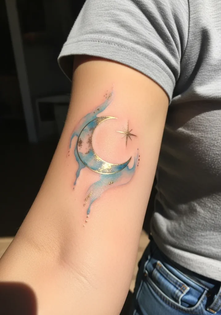 This tattoo shows a crescent moon with small stars on the upper arm, done in soft blues and hints of gold. The watercolor style adds a dreamy look, with gentle color blending that feels light and magical. The size is medium, making it noticeable without stealing all the attention.