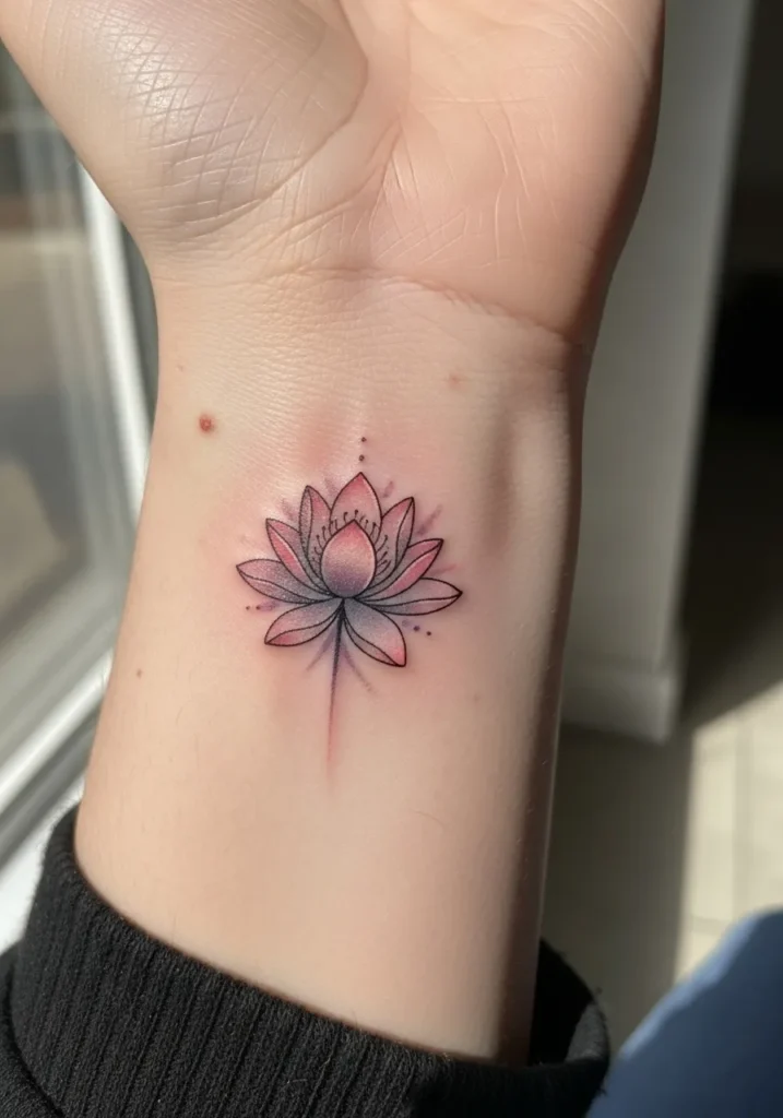 This is a small lotus flower tattoo placed on the inner wrist, created with fine lines and soft pink shading. The petals are simple and clean, and the color stays subtle, giving it a calm and graceful look. The placement makes it feel very personal and intentional.