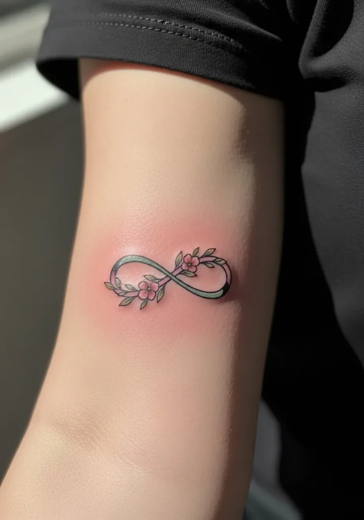 This tattoo features a small infinity symbol on the inner forearm, done in fine line style with soft pastel accents. The lines are clean and slightly curved, giving it a gentle flow rather than a sharp look. The coloring keeps it light and feminine.