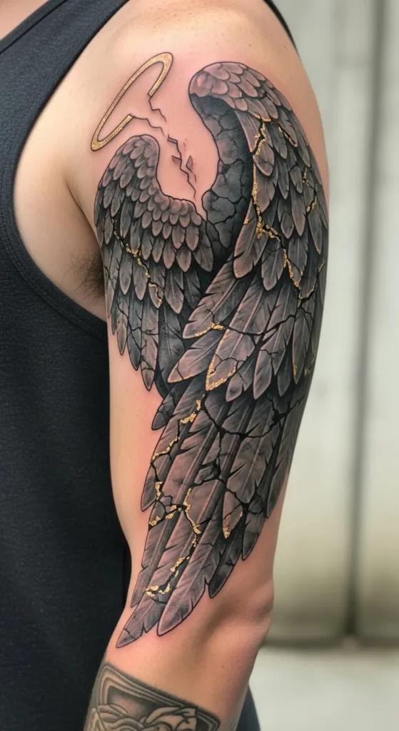I am absolutely obsessed with how this design flips the traditional angel tattoo on its head. To me, it feels like a beautiful tribute to the Japanese art of Kintsugi, where broken things are mended with gold to make them even stronger and more precious than before. It’s such a powerful way to represent healing or overcoming a tough chapter in life. Plus, that hint of shimmer against the dark, moody feathers is just pure magic and would look incredible under the sun.