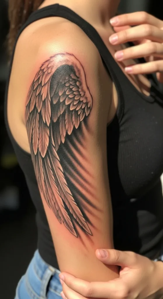 I feel like the “shadow” effect on this design is what makes it a total standout for anyone wanting a bit of edge. It gives off such a powerful vibe as if the wing is actually hovering just slightly off the skin rather than just being inked onto it. To me, this look represents a protector who has been through a few things and come out stronger on the other side. It is the perfect choice if you want something that feels both protective and incredibly cool.