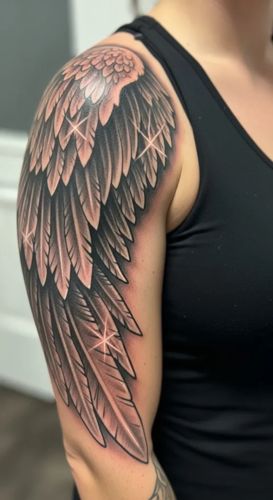 This stunning tattoo flows perfectly from the top of the shoulder down the upper arm in a bold black and grey realism style. The design features densely layered feathers that create a sense of weight and texture as they taper toward the elbow. What really makes this piece stand out are the crisp white ink highlights that look like twinkling stars or lens flares scattered across the darker feathers. It uses a rich gradient of charcoal tones and soft shading to give the wing a three-dimensional look that follows the natural curve of the body beautifully.