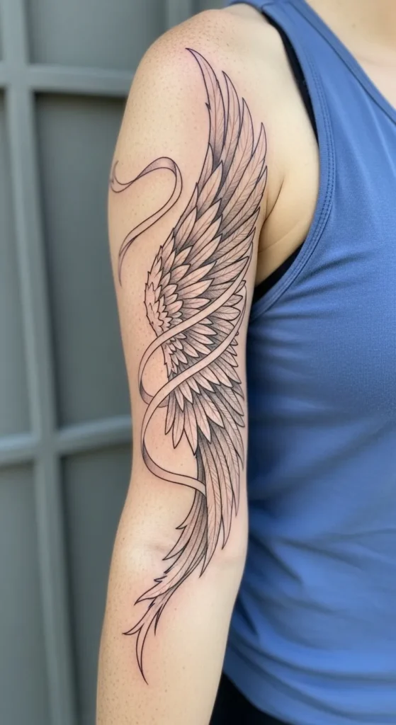 The way that ribbon twists around the wing gives the whole tattoo a sense of movement that standard wing designs usually lack. It feels like a piece of art that is caught in a gentle breeze rather than just sitting still on the skin. I feel like this is such a clever take on a classic symbol because it adds a touch of whimsy and elegance without being over the top. It is the perfect choice if you want something that looks powerful but still keeps a soft and feminine edge.