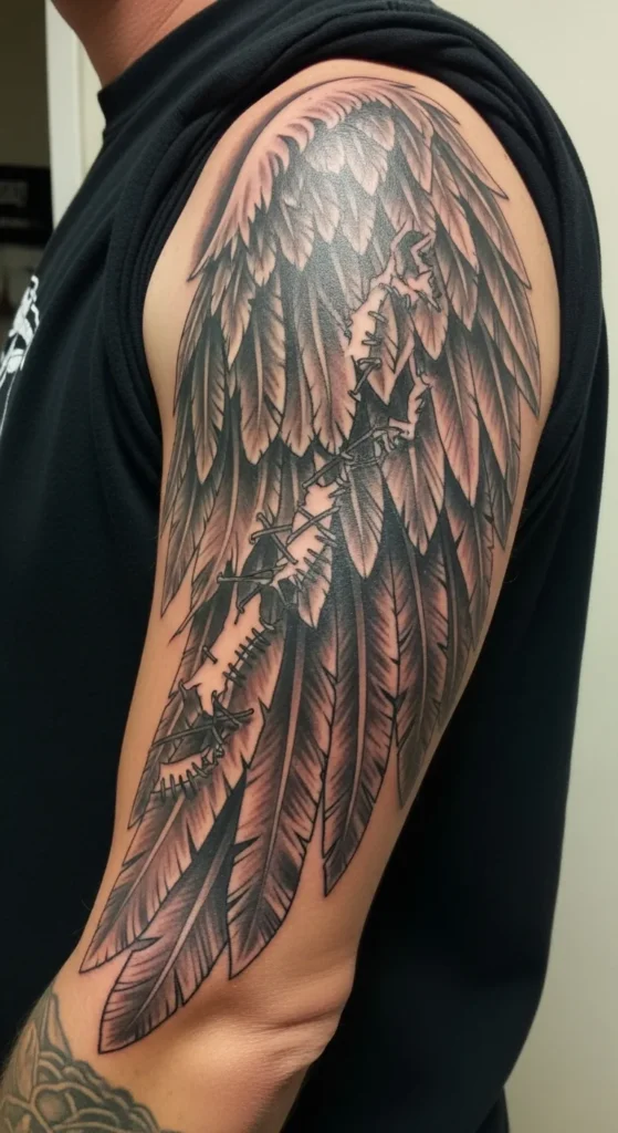 This piece takes over the entire upper arm with a bold black and gray wing that stretches from the shoulder down toward the elbow. It is a large and detailed design featuring heavy shading and deep ink saturation to give the feathers a realistic texture. The most unique detail is the jagged tear running straight through the center of the wing. It looks like it has been roughly sewn back together with thick stitches and heavy staples. The contrast between the soft feathers and the industrial metal elements makes for a powerful visual that really stands out against the skin.