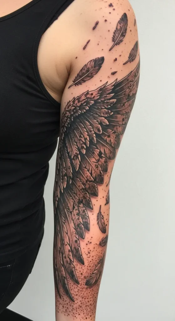This full sleeve tattoo stretches from the top of the shoulder all the way down the forearm in a beautiful display of black and grey realism. The design features a large and textured wing that wraps around the outer arm with incredibly detailed individual feathers. To add a sense of movement and depth, several smaller feathers appear to be drifting away from the main wing. The piece uses soft stippling and dotwork shading to create a gritty yet sophisticated look, while small dark speckles around the edges give it a unique weathered texture that feels very modern.