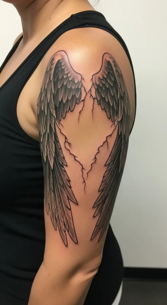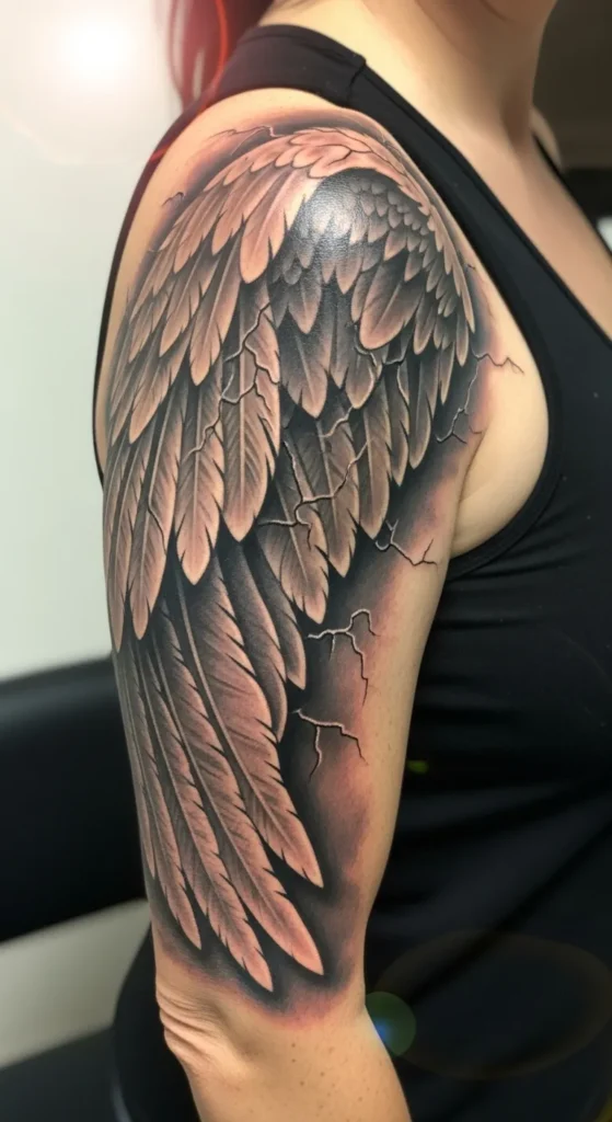 This bold upper arm sleeve features a pair of large angel wings that wrap around the shoulder and bicep in a symmetrical layout. The style leans heavily into illustrative realism with deep black and grey shading that gives each feather a heavy, textured feel. What really makes this piece pop is the negative space in the center where jagged lightning bolts or cracks seem to rip through the skin between the wings. It covers most of the outer arm and uses high contrast tones to create a look that feels both powerful and a bit edgy.