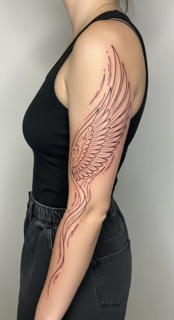This large vertical wing stretches beautifully from the top of the shoulder all the way down to the forearm. It is a masterclass in minimalism, using delicate black ink to create a sense of movement rather than heavy shading. The top of the wing features elongated, wispy lines that mimic the upward sweep of flight, while the center is grounded by tightly packed, detailed feathers. The design then tapers off into long, fluid strokes that trail down the arm like a soft breeze, making the whole piece feel incredibly light and organic against the skin.