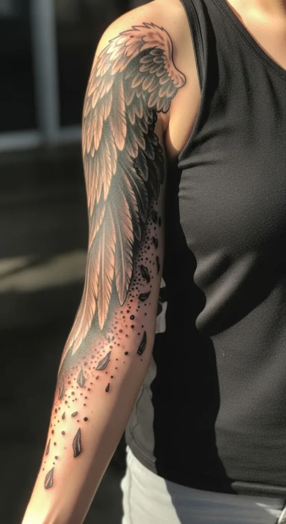 This gorgeous piece flows beautifully from the top of the shoulder right down to the mid-forearm. It features a large feathered angel wing that transitions from heavy black shading at the back to softer and more delicate grey tones on the outer arm. The detail is incredible, with each feather looking soft and layered. What makes it really unique is how the bottom of the wing seems to crumble away into a scatter of tiny floating particles and falling feathers. It uses a high-contrast black and grey style that makes the whole design pop against the skin without needing a drop of color.