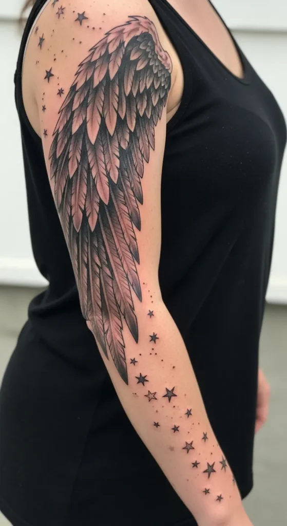 This black-and-grey sleeve ink features a large angel wing that flows down the upper arm with incredible detail in every feather. The artist used soft shading and gradient transitions to give the plumage a realistic texture while keeping the look light and airy. Scattered around the main wing are delicate five-point stars and tiny dots that trail down the forearm like a trail of cosmic dust. It is a bold piece that occupies most of the outer arm but manages to feel feminine and whimsical due to those tiny celestial details.
