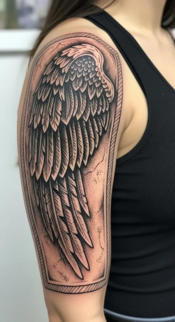 I enjoy how this looks like a piece of living sculpture rather than just a standard wing floating on the arm. The border gives it a finished, intentional feel that reminds me of a high-end gallery piece or a fragment of a cathedral wall. It feels powerful and protective, like wearing a personal shield. I’ve always thought that adding a geometric frame to organic shapes is a brilliant way to make a tattoo stand out and look super polished.