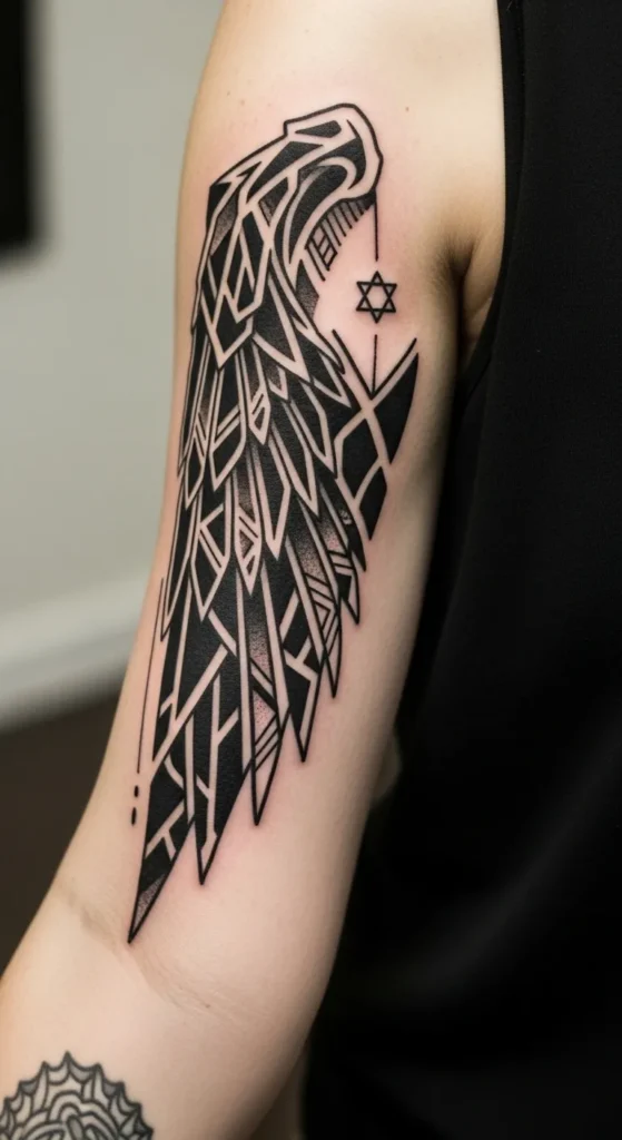 This striking piece sits boldly on the outer upper arm, stretching from the shoulder down toward the elbow. It breaks away from traditional soft feathers by using a sharp, geometric blackwork style that feels modern and edgy. The design is packed with heavy black ink saturation and crisp white negative space lines that create a shattered glass effect within the wing shape. A small, delicate Star of David is tucked neatly into the top right corner, adding a personal touch to the bold linework. The use of stippling and dotwork gradients gives the bottom edges a nice textured finish that keeps the heavy black from feeling too flat.
