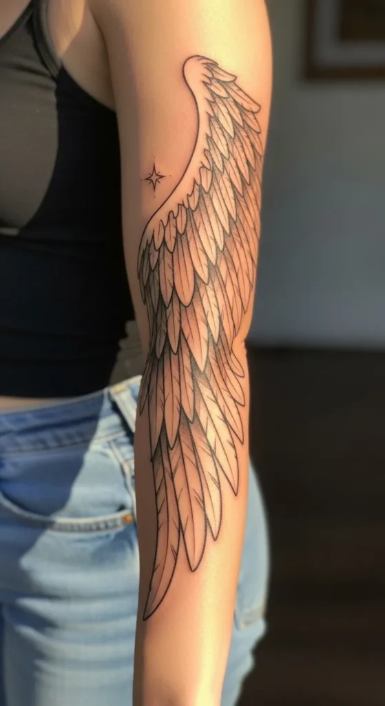 I’ve always felt that there is something so powerful about wearing a wing because it feels like you’re carrying your own personal protection everywhere you go. This specific layout is a total showstopper because it mimics the natural anatomy of the arm and makes the feathers look like they are actually part of your body. It has that perfect balance of being edgy enough to grab attention while still looking incredibly sophisticated and soft against the skin.