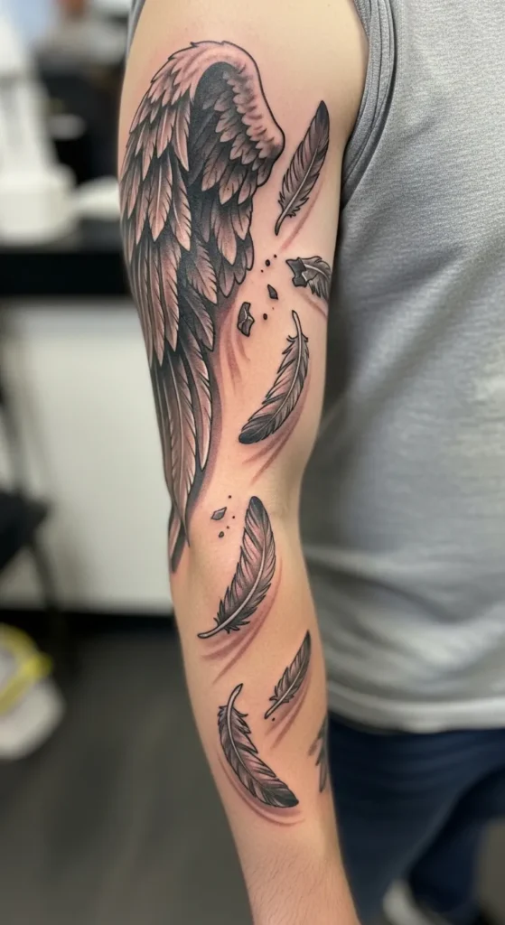 This black-and-grey sleeve features a beautifully detailed angel wing resting on the upper shoulder with several individual feathers drifting down toward the forearm. The placement uses the natural curve of the arm to create a sense of motion as if the wing is gently being shed in the wind. The style leans into soft shading and realistic textures without being overly heavy. You can see small debris and碎 fragments scattered between the feathers, which adds a unique touch of realism to the overall flow. It spans from the top of the bicep down to the wrist area, making it a bold statement piece that still feels airy and light.