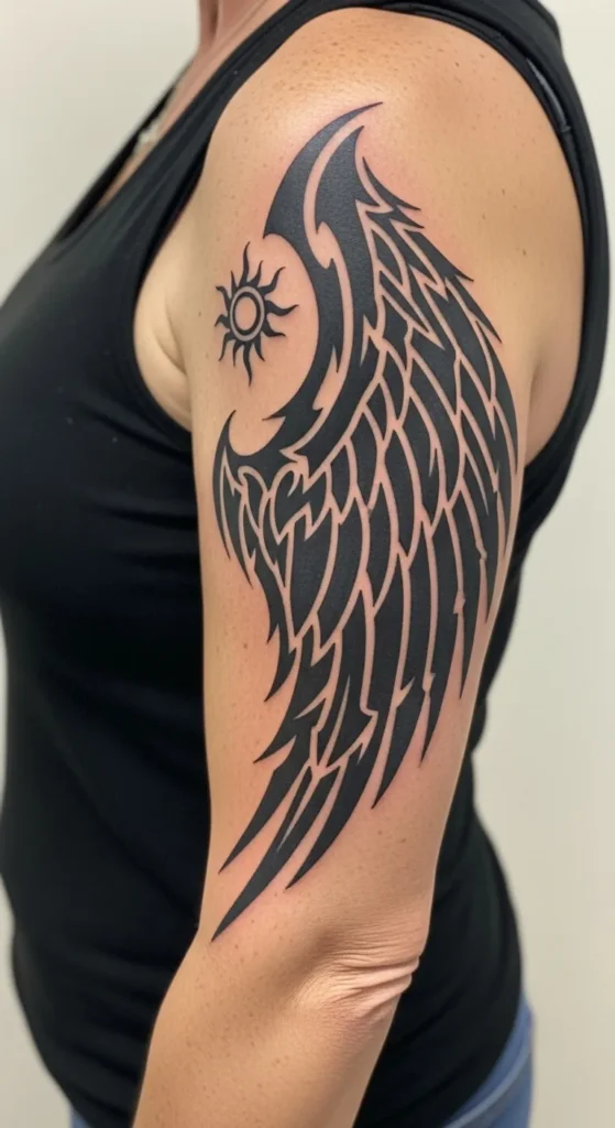 This striking piece takes over the upper arm with a high-contrast blackwork style that really pops against the skin. It features a sharp tribal angel wing that flows from the shoulder down toward the elbow, using thick lines and negative space to create a sense of movement. Tucked right into the curve of the wing is a crisp sun symbol with pointed rays, adding a focal point that ties the whole sleeve together. The solid black ink and sharp edges give it a powerful look that feels both modern and timeless.